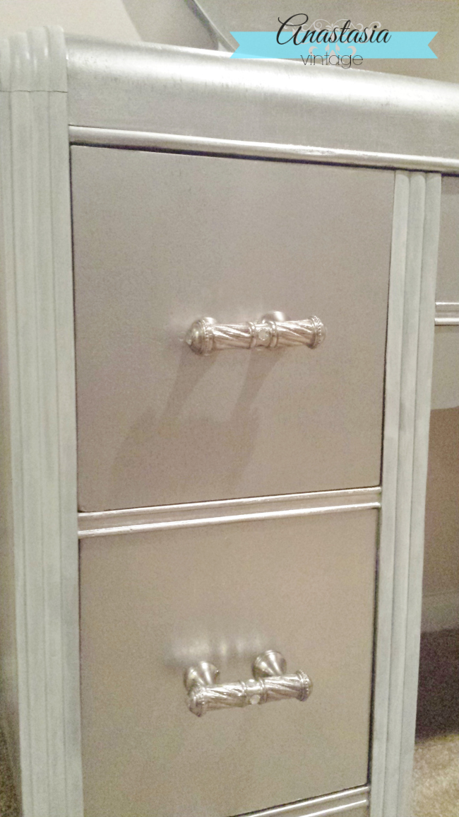 When we got the request to give this art deco vanity a vintage glam makeover, I was over the moon. I love the lines and curves of art deco pieces – they remind me so much of flappers and The Great Gatsby.